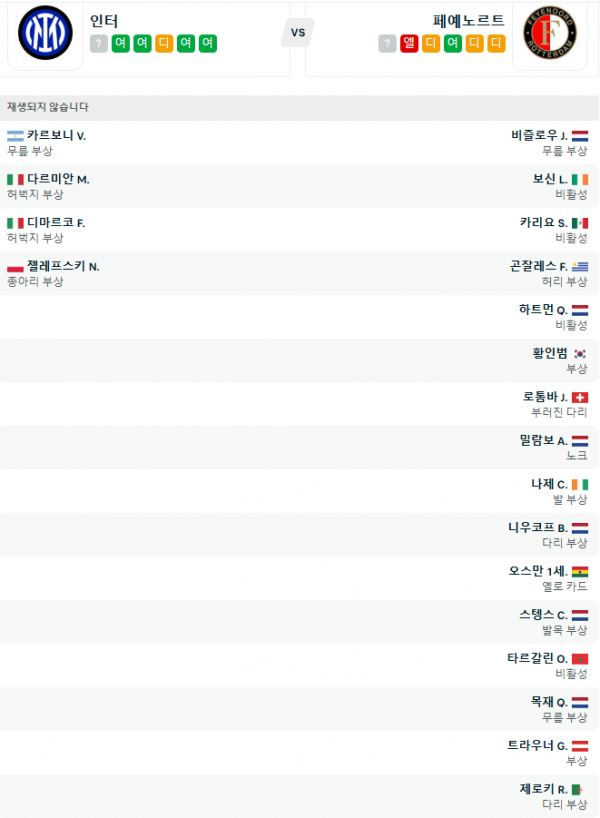 분석: 최근 맞대결에서 인테르는 페예노르트를 원정에서 무난히 제압했습니다. 인테르는 공격과 수비 모두에서 더 나은 모습을 보여주며 우위를 점하고 있습니다. 페예노르트는 인테르와의 경기에서 볼 점유율과 수비 집중력 향상이 필요합니다.