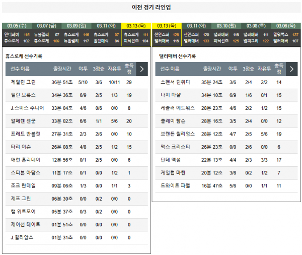 - 2024-04-01: 휴스턴 107-125 댈러스 (홈 패)
