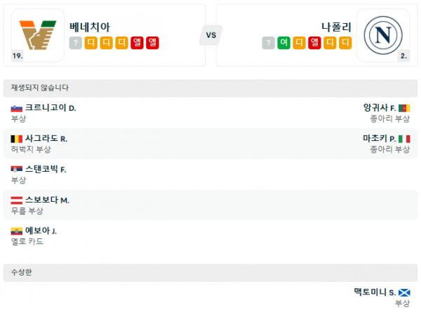 베네치아 FC와 SSC 나폴리의 최근 양팀의 리그 현재 순위 및 최근 10경기 승패 전적