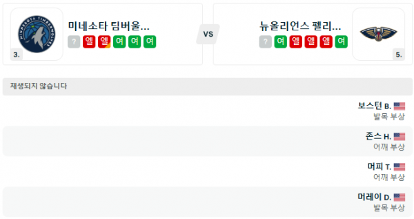 최근 10경기 상대 성적: 미네소타 팀버울브스 5승, 뉴올리언스 펠리컨스 5승