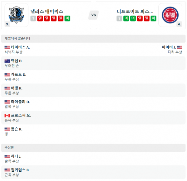 댈러스 매버릭스 (Dallas Mavericks) vs 디트로이트 피스톤스 (Detroit Pistons) 최근 성적 및 분석