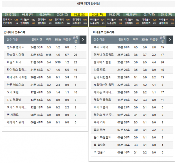 3월25일 08:00 인디애나 VS 미네소타