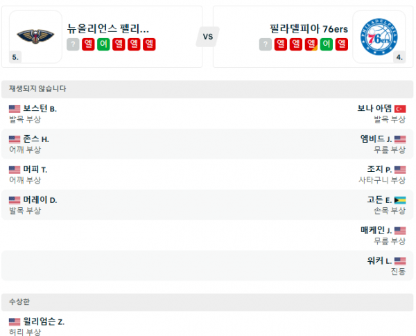 부연 설명: 필라델피아 세븐티식서스 또한 뉴올리언스 펠리컨스와 유사한 부진을 겪고 있습니다. 최근 경기에서 공격과 수비 모두 불안정하여 승리를 거두지 못하고 있습니다. 몇 경기에서는 상대 팀에게 큰 점수 차로 패배하는 등, 전반적인 경기력 회복이 필요합니다.