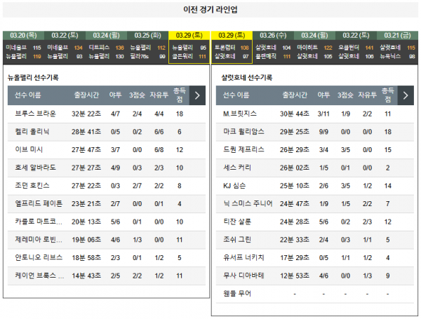 3. 2023-03-22: 미네소타 팀버울브스 134-93 (원정 패) - 수비의 취약점이 심각하게 드러남.