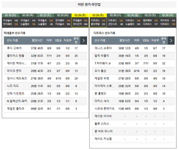 두 팀의 최근 5경기 성적에서는 미네소타가 높은 득점력을 바탕으로 승리를 가져가고 있으며, 디트로이트는 수비력 보강을 통해 상승세를 이어가고 있습니다. 디트로이트 피스톤스의 최근 공격력과 미네소타 팀버울브스의 득점력 간의 경합이 예상됩니다.