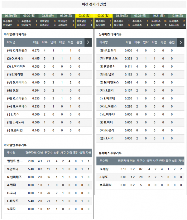 마이애미 말린스 (Miami Marlins)와 뉴욕 메츠 (New York Mets)의 최근 경기 전적 및 분석은 다음과 같습니다.