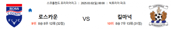 - 부연 설명: 킬마넉은 로스 카운티보다 한 단계 아래의 순위에 있으며, 최근 경기에서는 약간 기복 있는 모습을 보이고 있습니다. 득점력이 상대적으로 부족하며, 집중력이 요구되는 경기 운영이 필요합니다.