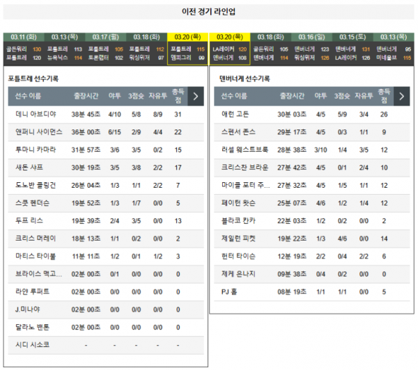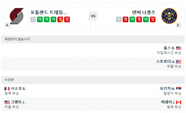 포틀랜드 트레일블레이저스(포틀트레)와 덴버 너게츠(덴버너게)는 현재 각각 리그 4위와 2위에 위치하고 있습니다. 양팀은 최근 10경기에서 각각 4승 6패, 6승 4패의 성적을 기록하고 있으며, 포틀랜드는 최근 2연승, 덴버는 최근 1승 후 패배를 기록 중입니다. 이 두 팀은 서로 다른 플레이 스타일을 갖고 있으며, 포틀랜드는 득점에서 다소 안정적이나 수비에서 개선이 필요한 반면, 덴버는 강력한 공격력을 보이며 승리를 거두고 있습니다.