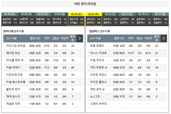 2023-03-26: 덴버 129-106 밀워키 (홈 승)