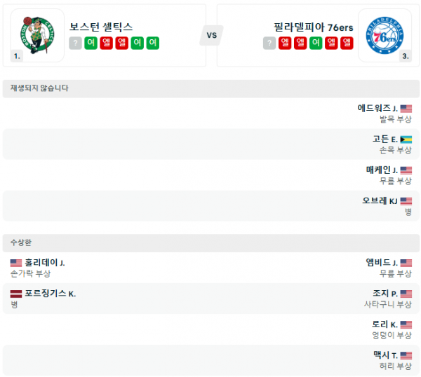 - 분석: 필라델피아는 최근 5경기에서 1승 4패로 아쉬운 성적을 기록했습니다. 골든 스테이트 워리어스와의 경기에서 유일한 승리를 거두었지만, 수비적으로 많은 문제를 드러내며 패배를 쌓고 있습니다.