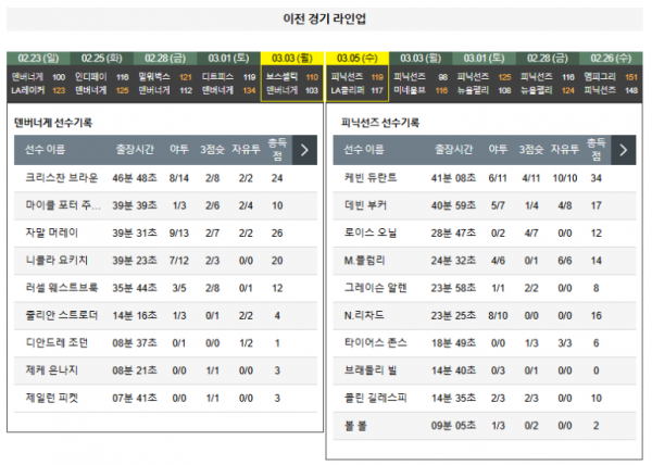 덴버 너게츠와 피닉스 선즈는 현재 서로 다른 위치에 서 있으며, 덴버는 강력한 공격력과 잘 정비된 팀워크로 경기에서 우위를 점하고 있습니다. 반면 피닉스는 수비적 약점을 보완하는데 어려움을 겪고 있는 상황입니다. 이번 경기에서도 덴버가 피닉스를 상대할 때 높은 득점과 강력한 수비로 조금 더 유리한 경기를 펼칠 것으로 기대됩니다.
