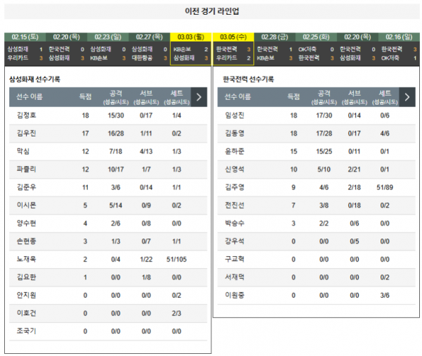 - 2025-02-20: 한국전력 0-3 삼성화재