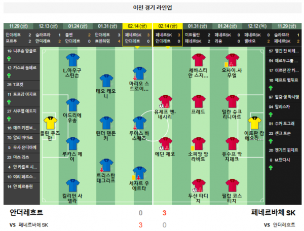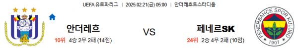 - 2025-02-14: 페네르바체 3-0 안더레흐트