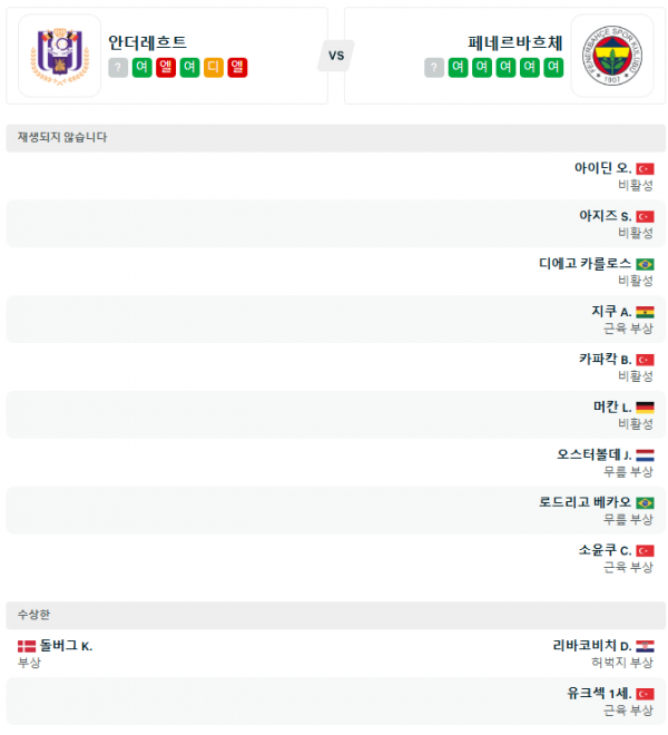 **분석**: 안더레흐트는 최근 5경기에서 2승 0무 3패로 고르지 못한 성적을 보이며, 페네르바체는 4승 1무로 무패 행진을 거듭하고 있습니다.