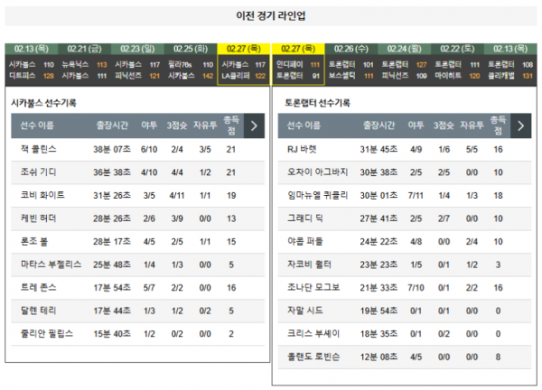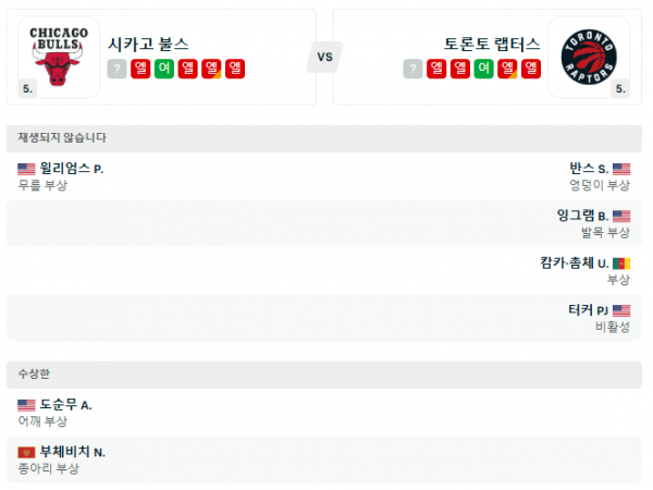 부연 설명: 토론토 랩터스도 불스와 유사하게 최근 부진한 경기력을 이어가고 있다. 공격과 수비 모두에서 고른 경기력을 보여주지는 못하고 있으며, 특히 중요한 고비에서의 집중력 부족이 패배의 원인으로 작용하고 있다. 이는 팀의 전반적인 사기에도 영향을 미치는 것으로 분석된다.