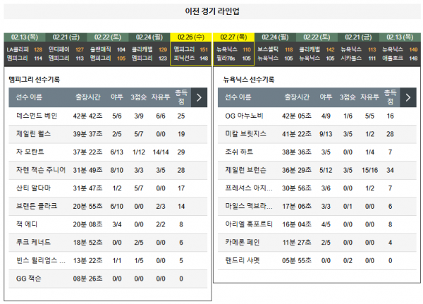 - 2025-01-28: 뉴욕닉스 143:106 멤피그리 (원정 패)