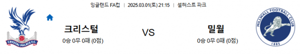 3월1일 21:15 크리스탈팰리스 VS 밀월