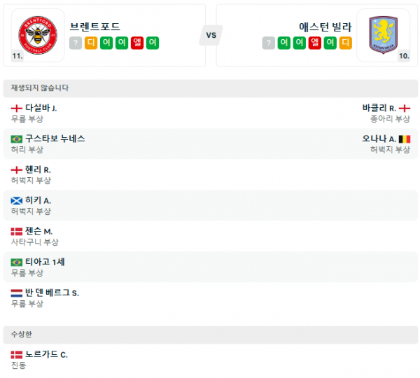 - 23-07-31: 애스턴 빌라 3-3 브렌트포드 (원정 무)